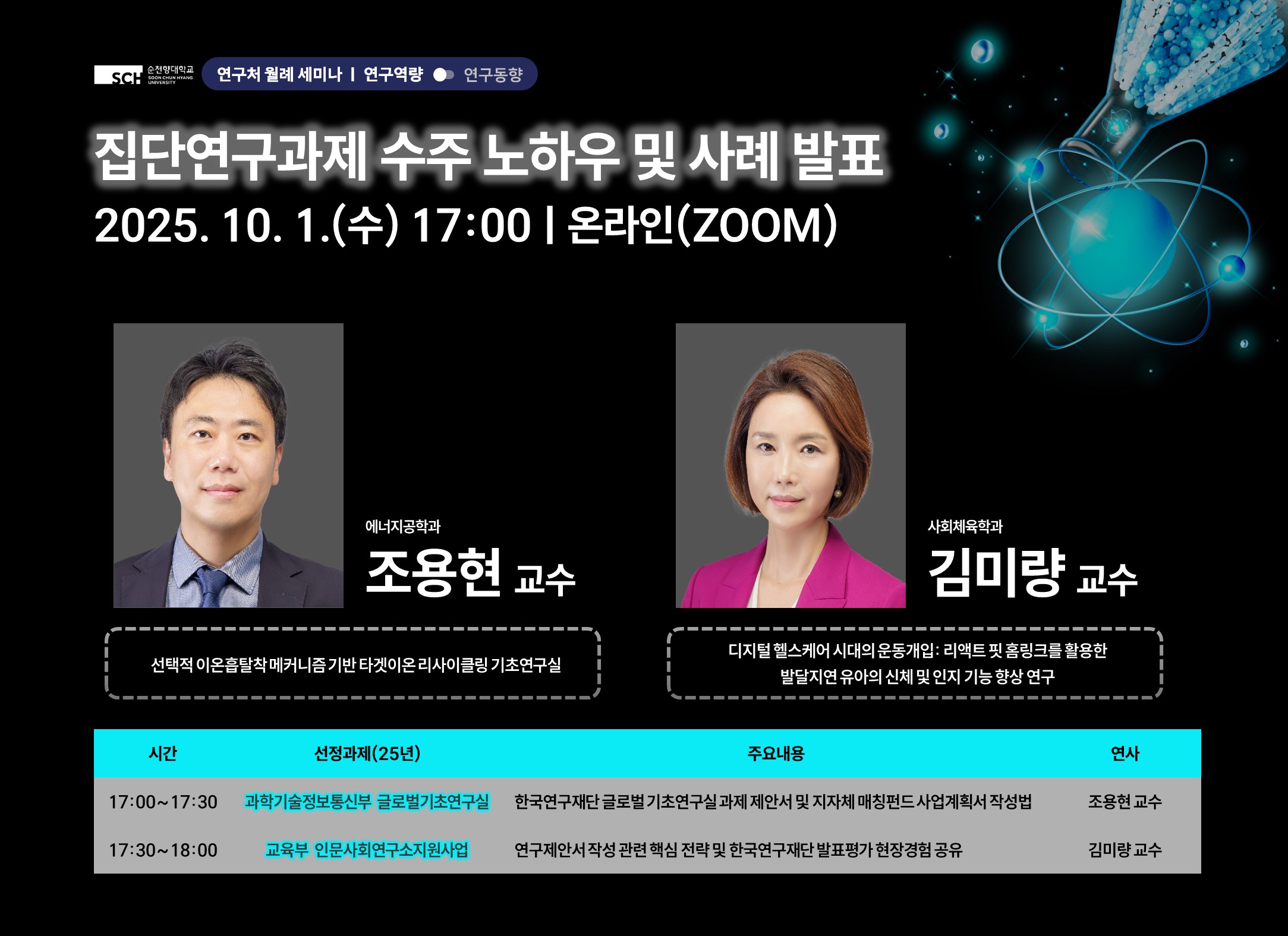 2025년 10월 SCH 연구역량 세미나ㅣ집단연구과제 수주 노하우 및 사례 발표(과기부 기초연구실, 교육부 인문사회연구소)ㅣ2025.10.1.(수) 17:00