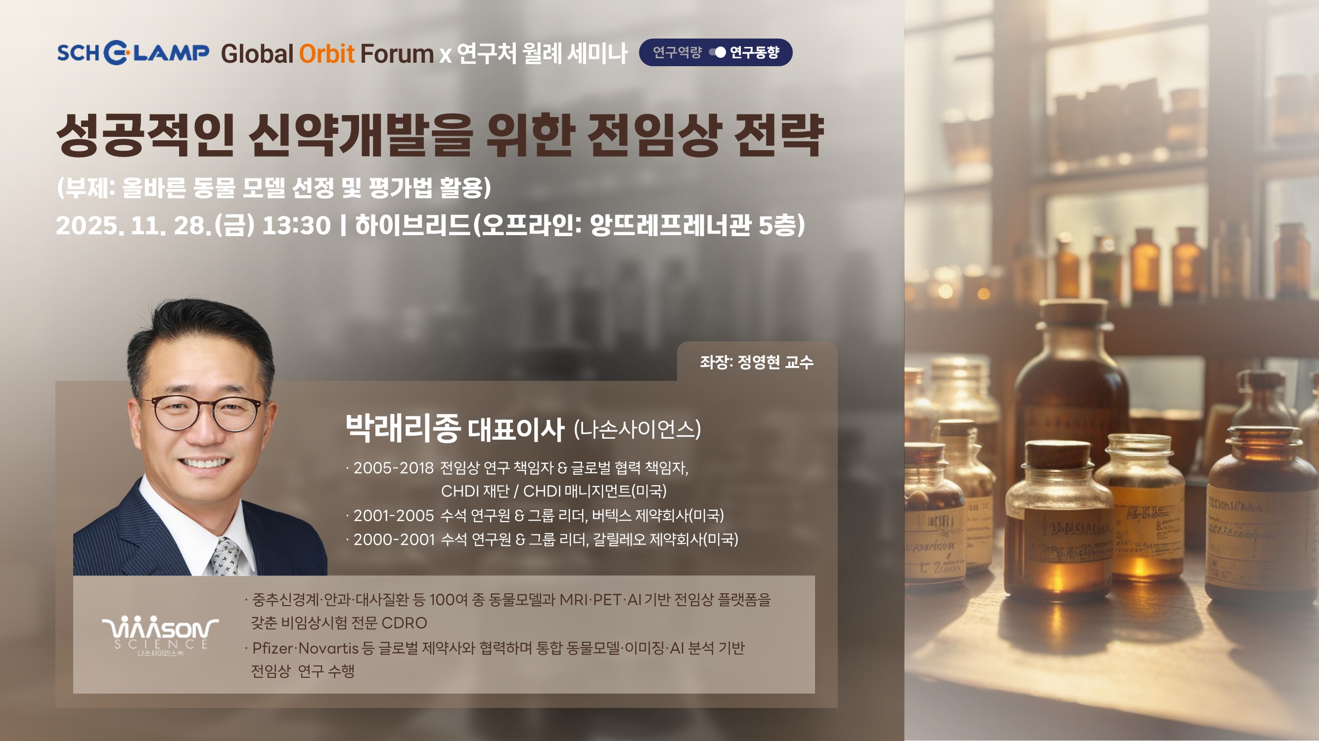 2025년 11월 SCH 연구동향 세미나xG-LAMPㅣ성공적인 신약개발을 위한 전임상 전략ㅣ2025.11.28.(금) 13:30