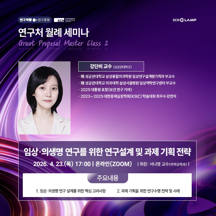 2026년 4월 SCH 연구역 세미나(Grant·Master ClassⅡ)] 임상·의생명 연구를 위한 연구설계 및 과제 기획 전략ㅣ강단비 교수(성균관대학교)ㅣ2026.4.23.(목) 17:00