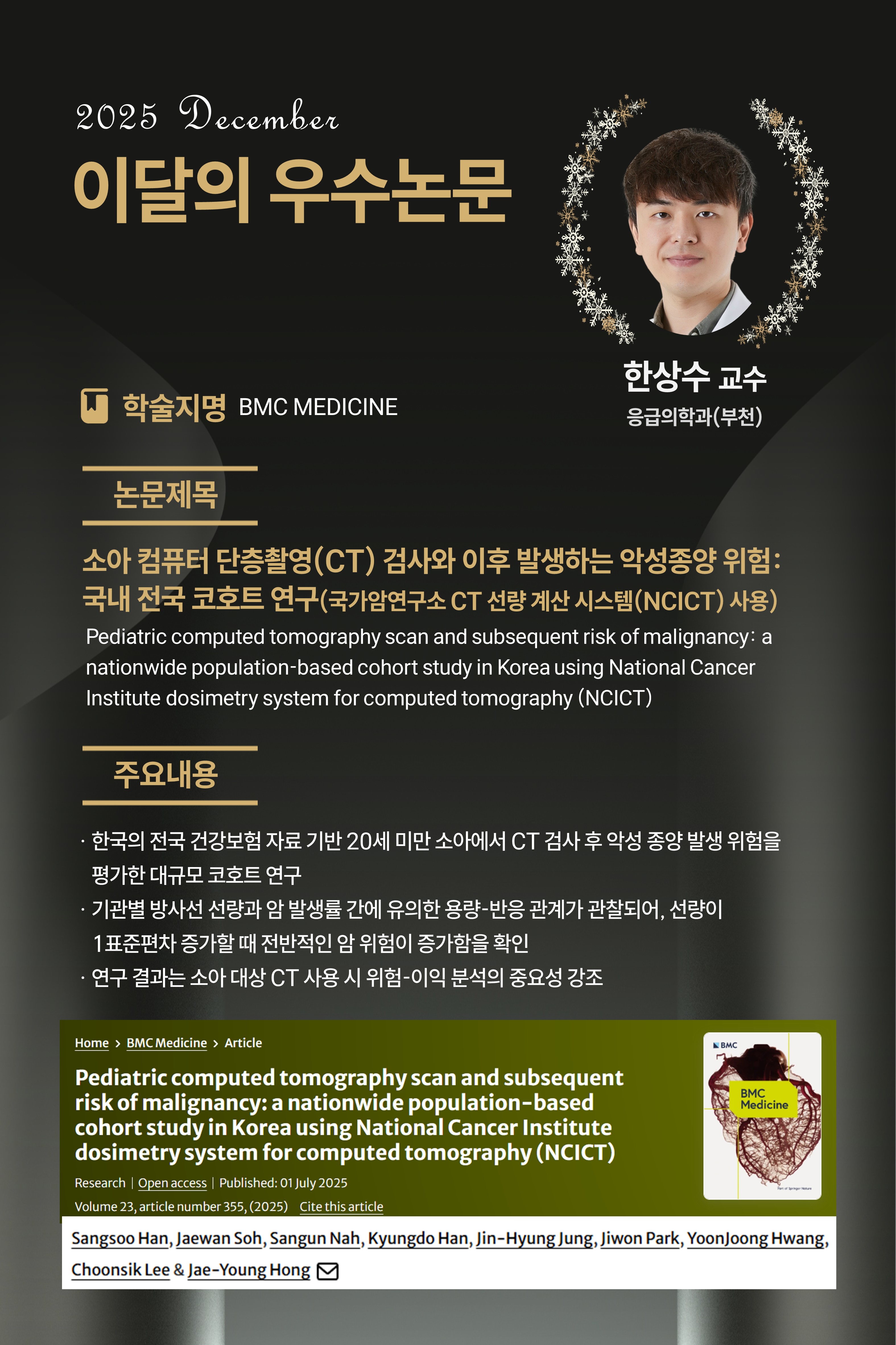 [25년 12월] Pediatric computed tomography scan and subsequent risk of malignancy: a nationwide population-based cohort study in Korea using National Cancer Institute dosimetry system for computed tomography (NCICT)